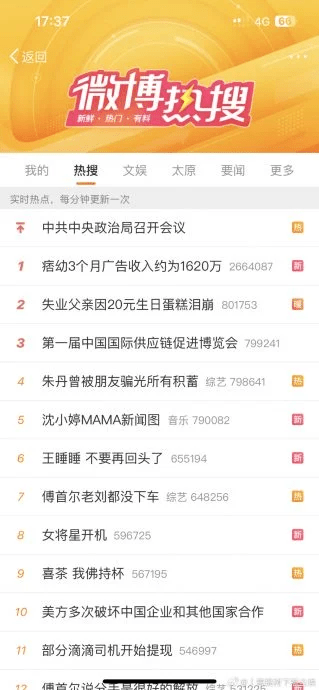 不过,有眼尖网民发现,热搜榜第一名是网红3个月广告收入达1620万元(约1064万令吉),与第二名形成强烈对比,让许多网民心有戚戚,“同一个世界,天差地别”、“是这位父亲不努力吗?是社会分配出了问题”、“看完我泪奔了,这个老父亲不努力吗?我们不努力吗?”