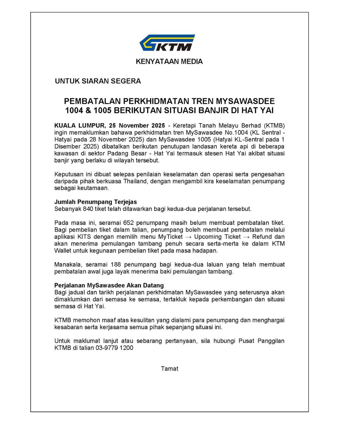 根据最新消息,由于泰国合艾一带发生严重水患,导致巴东勿刹至合艾的铁路路段多处无法通行,合艾车站也被迫关闭。KTMB在评估安全与运营状况后,并获得泰国当局的确认,决定取消以下两趟跨境观光列车: