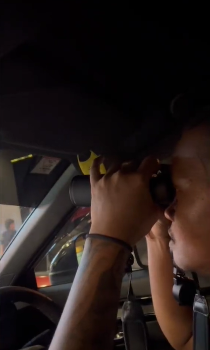 视频中,这名来自沙巴山打根男子把车子停在一家奶茶店前,然后用望远镜从车内查看店内的菜单。
