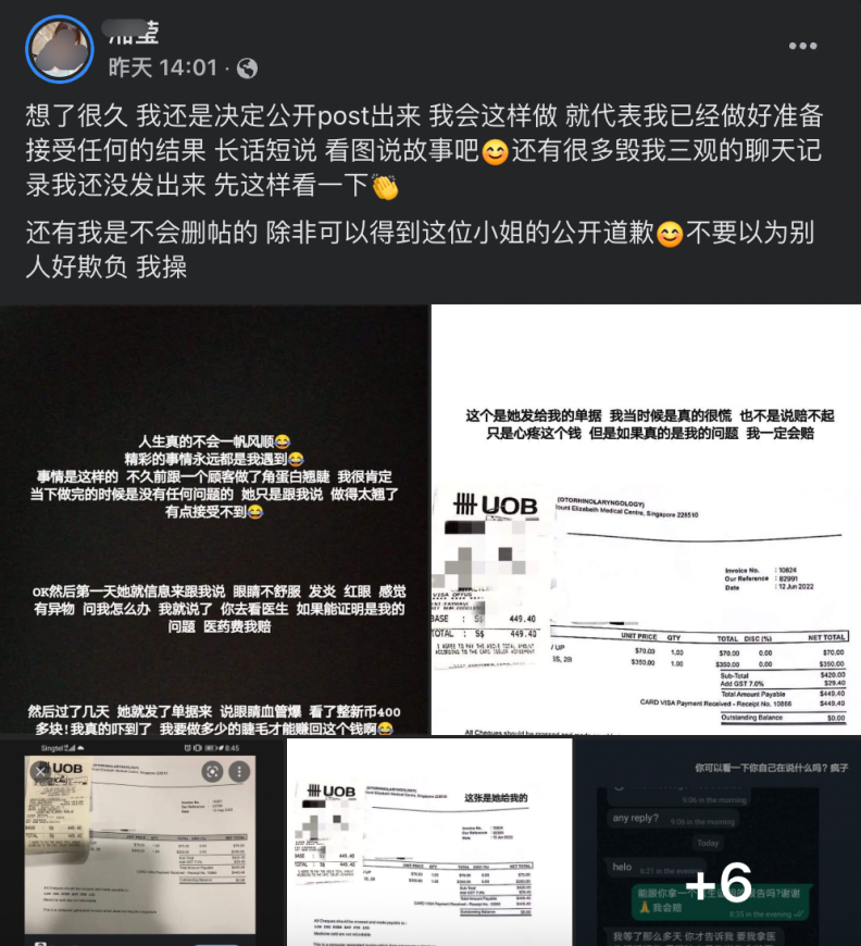 过了几天后,S小姐就很突然发收据给C小姐,说经过医生检查证实眼睛血管爆,看了整新币400多块,把C小姐吓坏了!