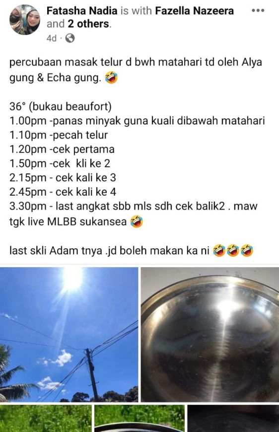 这名Fatasha Nadia在Facebook自己的账号上分享一则贴文,说着自己挑战在烈日下煎蛋,而且附文说明细节时间表,自己是几点去检查和查看鸡蛋的情况,还有各个时段的照片!