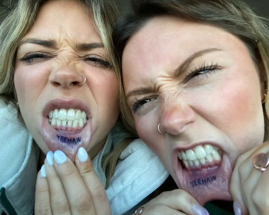 8名女孩和Taylor的下唇上都纹有“YEEHAW”一词,其中一名女孩将它纹在了臀部,另一名女孩则纹在了脚上。