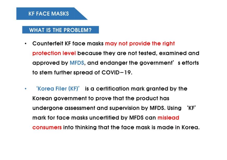 大使馆提醒在MFDS网站上,检查KF80、94或AD(防飞沫)产品真伪的指南。