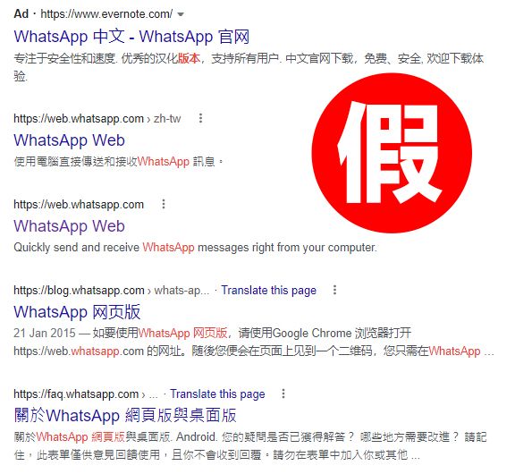 当用户在Google上搜寻WhatsApp网页版,搜寻结果出现虚假网站,毫无防备心用户一不小心就会点击进去,让骇客有机会盗取WhatsApp用户资料。