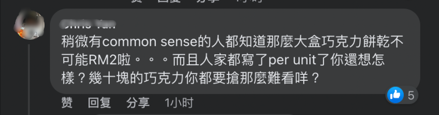 贴文一出,网民纷纷嘲讽原PO没有Common Sense「如果RM2能买到一盒24unit我会怀疑我穿越了我啊公的时空」、「其实,有时候commensen才是生活在世间最重要的事情」、「我觉得智慧及common sense很重要,不然rm2卖你一整盒咩」、「我建议你告到koko krunch去,可能可以终身免费吃,虽然看得出价钱表形容产品25gx24是有点不是很贴切。。不过应该连小学生都会懂那个rm2是指1条」