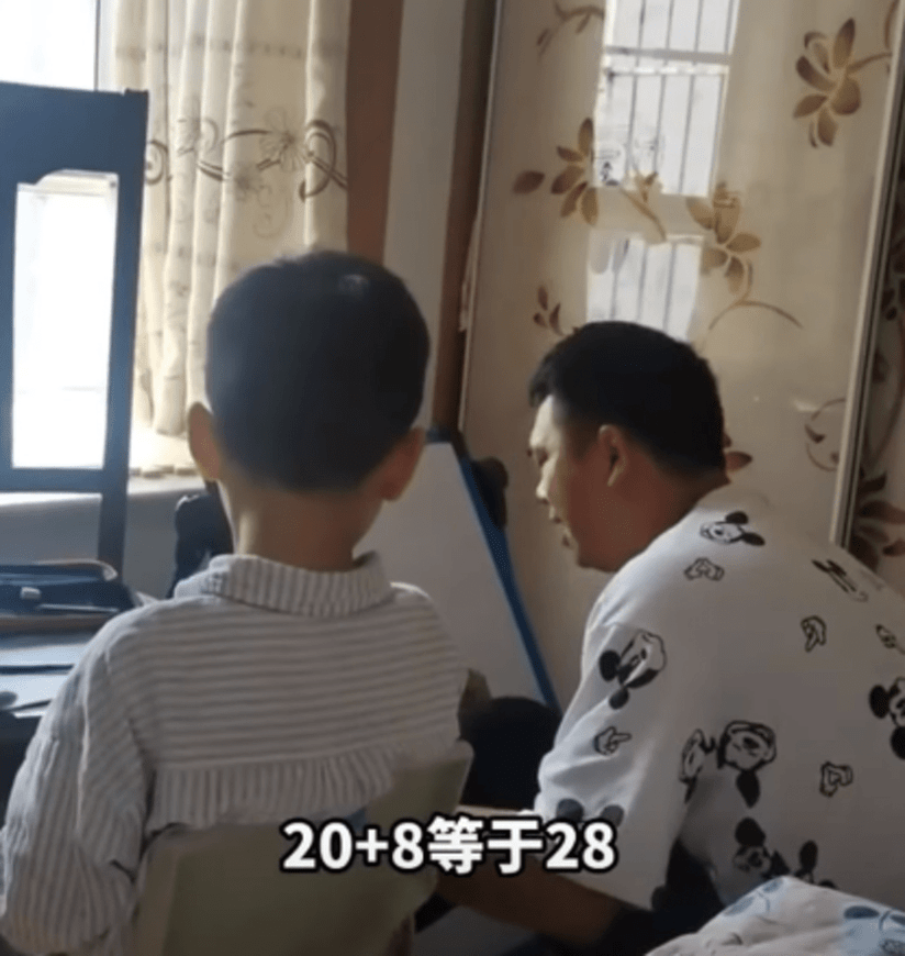 儿子先是愣了一会,接着大声复诵爸爸的问题「20+5,等于…」,之后却一个字也答不出来,孩子的爸崩溃朝着旁边的衣柜就是一阵头槌,后方的妻子也笑了。
