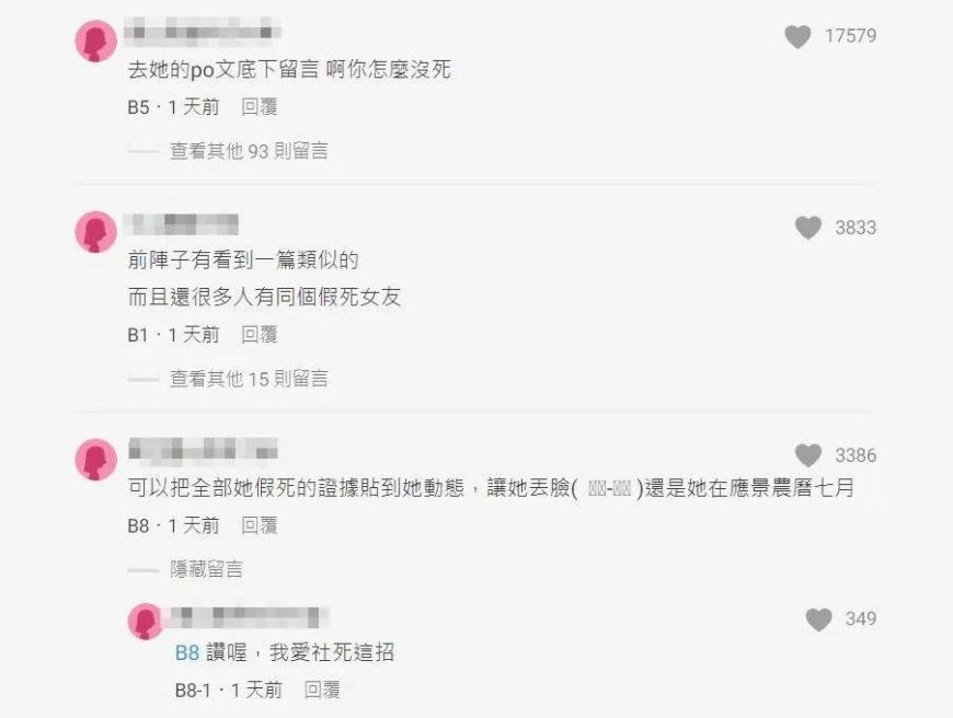 此文一曝光后,立刻引起网民热议,甚至提供反击方式,「去她的po文底下留言:啊你怎么没死」、「可以把全部她假死的证据贴到她动态,让她丢脸,还是她在应景农历七月」、「可以发一篇纪念文到她版上,最后说很高兴在七月半能与妳重逢」;此外,也有网友怀疑真实性。