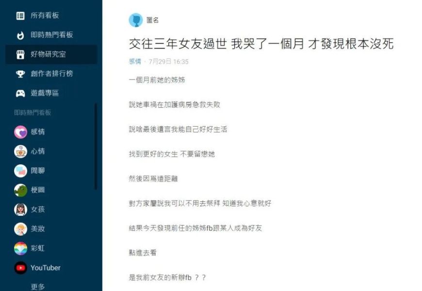 该名男子在Dcard发文表示,他和女友是远距离恋爱,已经在一起3年,1个月前女友亲姐姐告诉他女友遇车祸急救失败,向他转述最后遗言「希望你能自己好好生活,找到更好的女生,不要留恋我。」