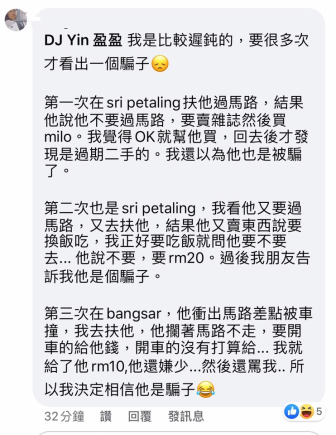 而在早前,本地DJ Yin盈盈也曾发布过一篇帖文,揭露该失明老伯的骗财手法和方式!