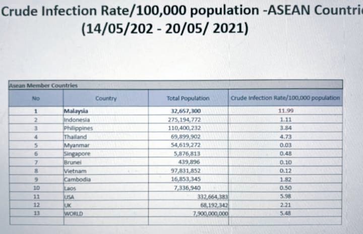 另外,他也发布了东南亚国家5月14日至20日的粗率感染率(Crude Infection Rate),大马以每10万人中有11.99人染疫,成为感染率最高的东南亚国家,接着是泰国(4.73人)、菲律宾(3.84人)、柬埔寨(1.82人)及印尼(1.11人)!