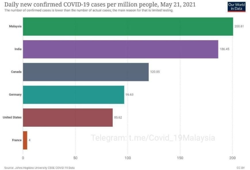 根据《星洲日报》指,祖基菲里(Dzulkefly Ahmad)今日在推特发布了《Our World in Data》的图表,显示各国在5月21日确诊病例数据,大马每日每100万人中有200.61宗确诊病例,高于印度的186.45宗、加拿大120.05宗、德国96.63宗,甚至也超过美国的85.62宗!