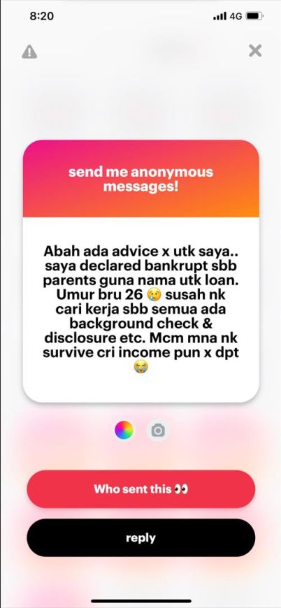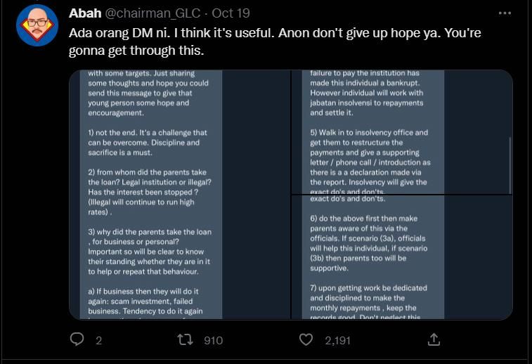 推特上,有一个“ABAH”的博主,晒出了自己DM的截图,文案是询问网友们该怎么帮助这位无名氏。起因是父母用孩子的名字去贷款,结果导致破产。年仅26岁的他因为应聘时有背景调查,所以根本找不到任何工作,也没有任何收入。
