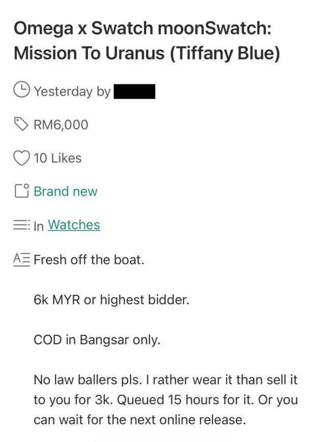 其中一名要以RM6000出售手表的卖家还放话不可以砍价,最低售价是RM6000,欢迎网民继续出价,价高者得「请不要出比这个更低的价格,如果你要我卖RM3000,我宁愿自己戴都不要卖给你,我可是排了15小时的队,不然,你可以继续等下次」