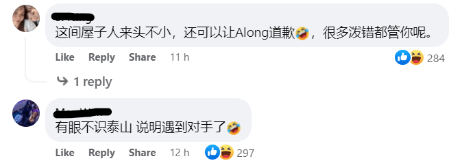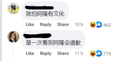 这则帖文随后在脸书疯传,至今已有超过1600次转发。有网友纷纷留言表示:“第一次看到阿窿会道歉”、“有文化的阿窿”、“有眼不识泰山”、“有担当的阿窿”、“泼到同行老大的家吗?”。