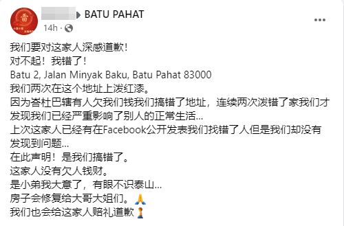 这名阿窿附上图片,图片中一间屋子被泼红漆。根据帖主表示,因为Batu Pahat有人欠钱,他们搞错地址,连续2次泼错家才发现已经严重影响别人的生活,于是才发文公开道歉。
