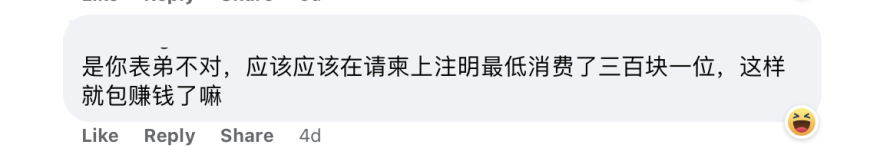 更有网友幽默表示应该在请柬上注明最低消费RM300一位,这样就肯定赚钱。