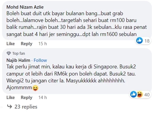 也有人叫他去新加坡工作,那就不用省钱了,轻轻松松月赚RM6000;当然有的网民劝他不要买,省回RM900