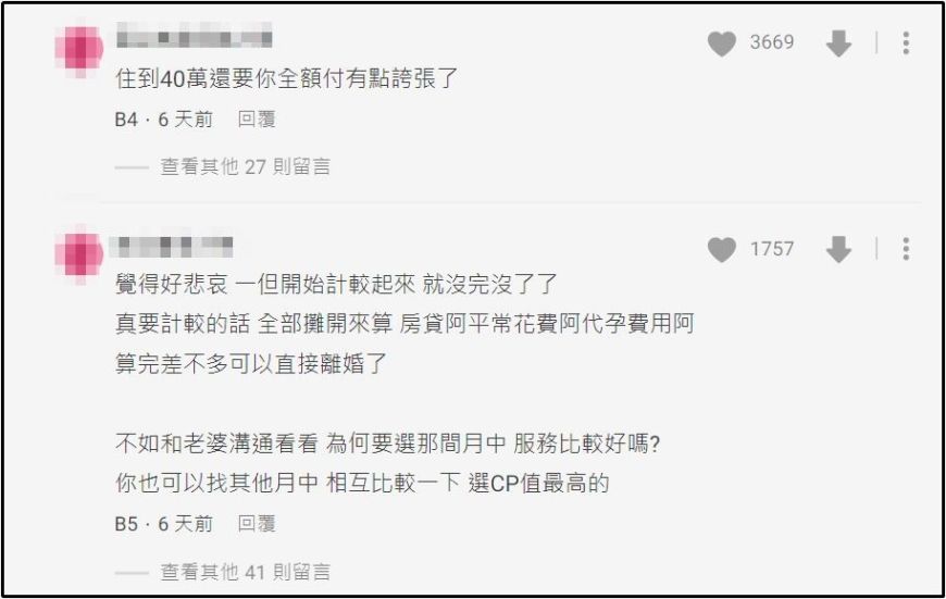 原PO对此感觉一万个委屈,毕竟房贷妻子只支付30%,但是两人却共同持有房子。如若原PO真的不爱对方,大可以不赞同这样的安排。因此,他气愤地表示,如果房贷评分,自己甚至可以让妻子住50万新台币(约马币RM70K)的月子中心都没问题。因此,他委屈地询问道: “这种想法很过分吗?”。