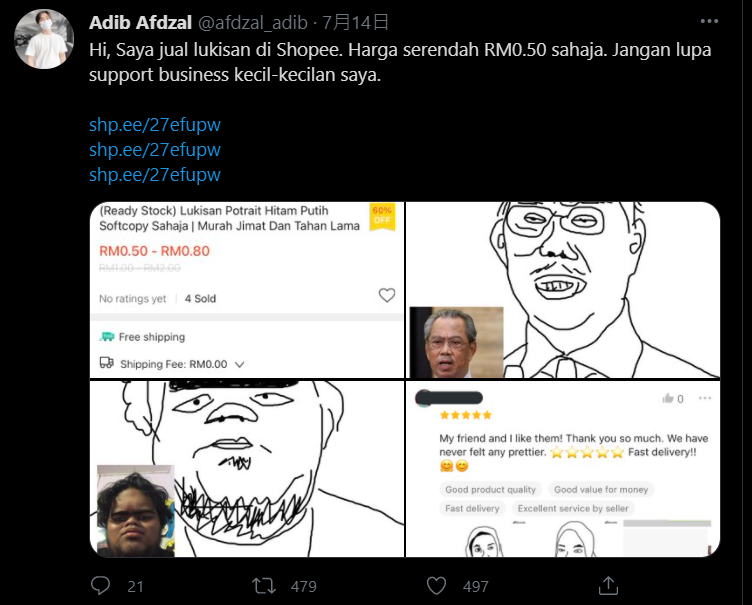 先说明,他的画并不是什么很有水准还是大师级的,而是很丑很随便的画作,这样都可以让他大爆单!据悉,这名男子为Adib Afdzal,他于7月14日在Twitter PO文表示自己在Shopee开店卖画,一张黑白色的画作只要RM0.50;色彩画作则需RM0.80!