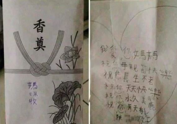每个人都有不同的庆祝方式,小孩子的话因为没有经济能力,一般都是送卡片。而一名小孩就因为用白色信封送母亲节卡片给妈妈,意外引起了笑料。