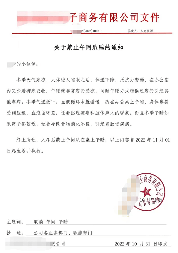 据报道称,文件显示是由该公司人力资源签发,落款是10月31日。文件写着“入冬后禁止午间趴在桌上午睡,自2022年11月1日生效并执行。”