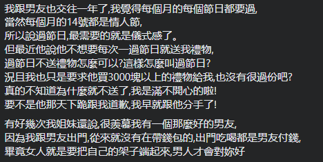 女事主与男友拍拖一年,称每个月14号都是情人节,讲好要送礼物,男友却不想这样了,令她不满,埋怨道“我也只是要求他买3000元新台币(约RM444)以上的礼物给我,也没有很过份吧?”,“要不是他那天下跪跟我道歉,我早就跟他分手了!”。