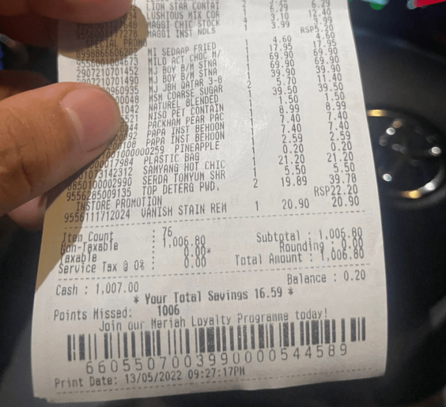 一名署名丹尼尔菲道斯的男网民在社交网站分享一张RM1006的收据,指妻子原本说只是进去买海南面食材,没想到就花了RM1000。