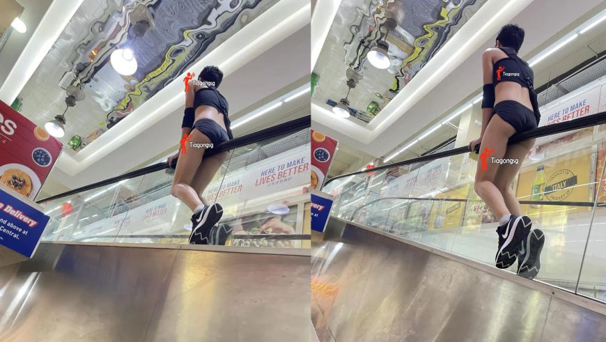 人人都有穿衣自由,我们都不可干涉,可是穿成这样大庭广众骑着手扶梯,难免会让人感到不安,毕竟手扶梯不是这样用的。