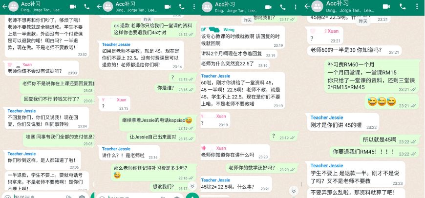 7位学生感到非常疑惑并要求老师退款RM420,老师才积极现身表示可以上课了,但上课时间却选在考试结束之后,学生们都说不用补了。老师对于学生们要求退款感到不满,她强调不能全额退款,还反驳学生不是她不想教,是学生们选择退课,最多只能退半额。对于只能退款半额这个操作学生也不买单,开始怀疑老师,要求老师出示Zoom平台被骇的证据,包括与Zoom客服的Email内容,但老师一直转移话题,逃避他们要求证据的短讯。