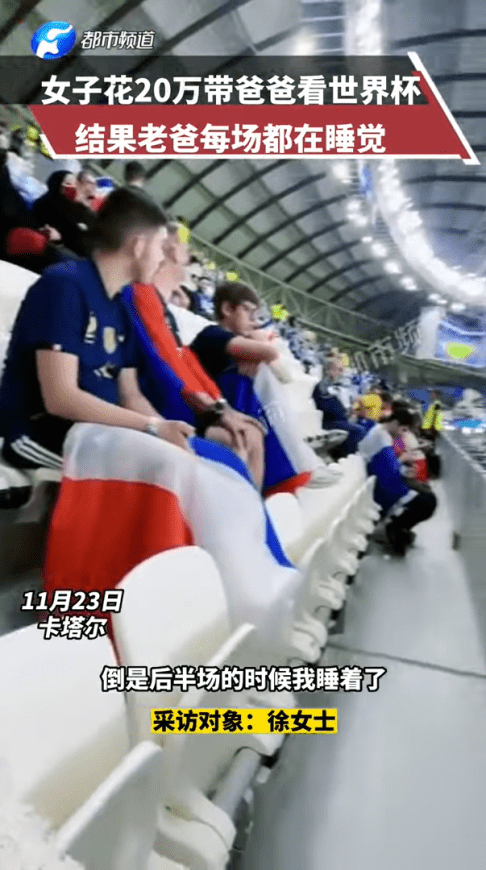 这位女子姓徐,在世界杯进行期间花了人民币20多万(约马币15万),带着爸爸一起飞,到卡达尔感受一下现场兴奋激动的氛围。结果他们到达现场之后,爸爸却开始打瞌睡!即使周围球迷们不断喊叫,非常激动,爸爸始终带着口罩,紧闭着双眼。她看到这一幕后惊到了,并且感到相当无奈。于是就出现了视频中的这一幕,她将睡着的爸爸和周围激动的球迷们都拍了下来并上载,形成强烈的对比!
