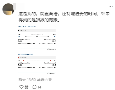 网民纷纷吐槽,指马航更改航班,已经对他们造成极大不便,“老早买好的机票,也请了年假,如今 却收到马航的航班改期通知,真的让人震惊。” “如果是同一天起飞,更换的是时间还好,但是如今却是提前数日起飞,真的太离谱了。”