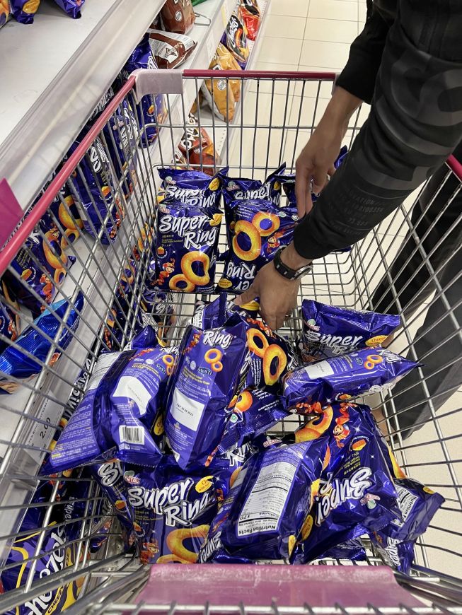 网友质疑手推车里面是否真有100包Super Ring,他回答有,从他的照片看到,他几乎把超市架子上的Super Ring给扫光了!