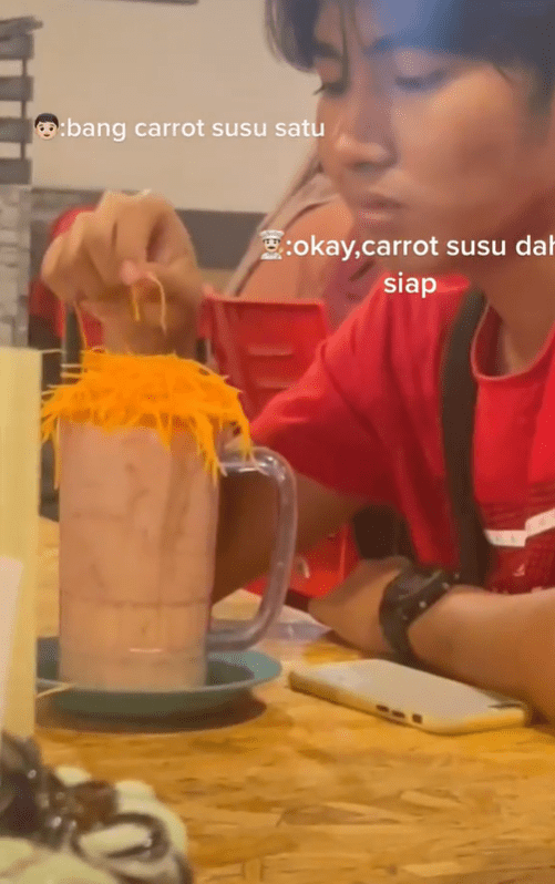 有时候想要喝的健康一点,免不了到了Kopitiam会order一杯carrot milk(萝卜奶)大马一名青年点了一杯carrot milk,结果出来时变成carrot dinosaur!