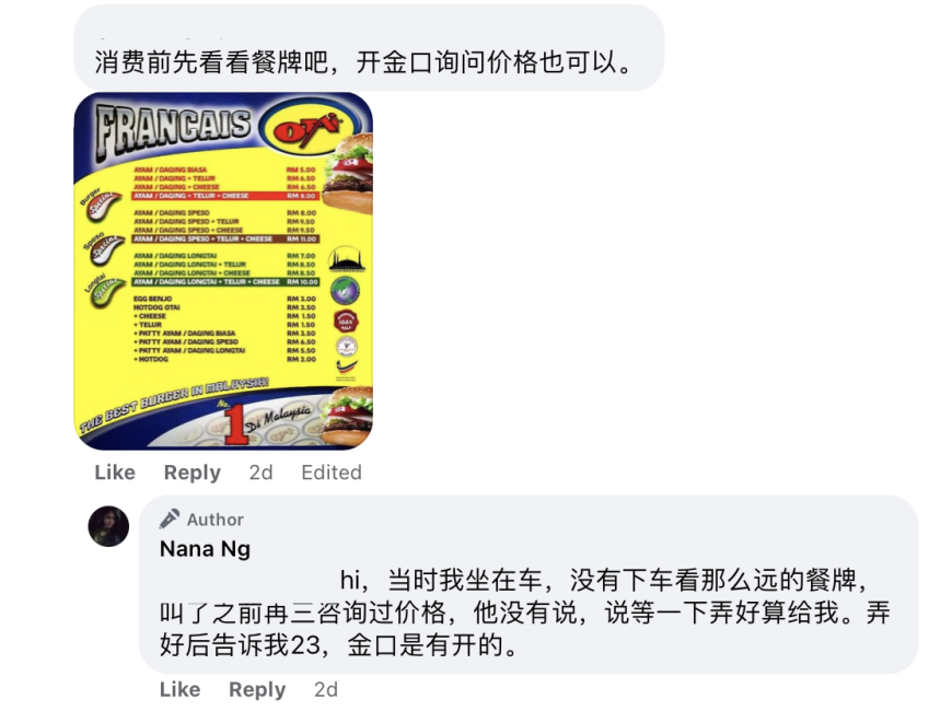 Nana在付款时听到2粒汉堡需要RM23后与店家再三确认后,店家告诉她special就是这个价格。