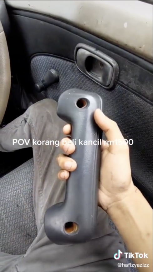 从视频中看到Hafizy花了RM1500买了个二手Kancil,只见他上车因关门稍微大力一点,车门的把柄直接被他扯了下来。