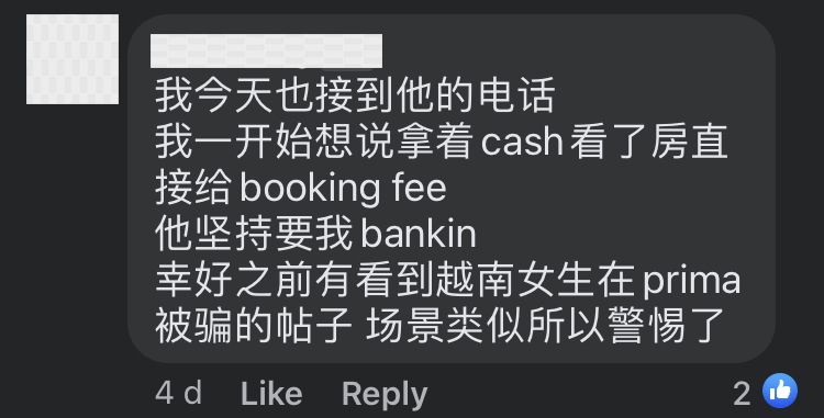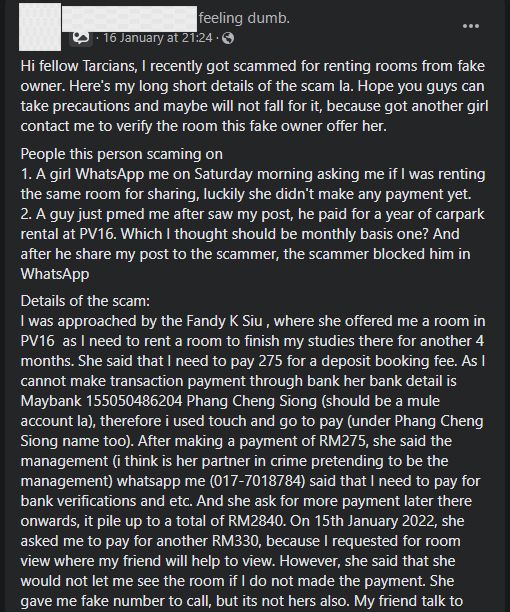 近日,一名拉曼生在面子书分享自己在吉隆坡租屋惨遭诈骗的经历。她分享该声称自己是屋主的女士要求她在租房前需先付booking fee,之后又跟她收取管理费用等等。接着网友要求要先看房,“屋主”竟然要求看房前需缴付看房定金,不然就无法看。付钱后,该学生抵达公寓想看房,才发现该屋子已经有住户,也找到了真正的屋主。该名网友表示自己前前后后共付了RM2800给对方,觉得这一切都是骗局!