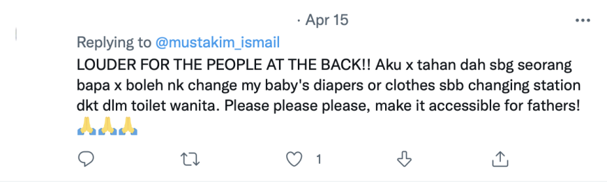 Sorry terpaksa redah je. Lain kali jgn ingt tugas wanita je tukar pampers anak. Benda ni tanggungjawab bersama. Kepada designer/architect, please alert bila design space2 mcm ni. Dah byk mall aku jumpa, changing room dlm toilet wanita. pic.twitter.com/zT3gmxji1E