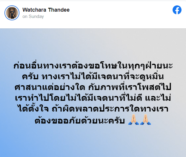 随后,他们也在Facebook上发文道歉:“首先,我们向大家道歉,我们没有任何侮辱宗教的意图。我们所发布的照片,也没有其他恶意。如果有任何冒犯到的地方,我们向各位表示真诚的歉意。”