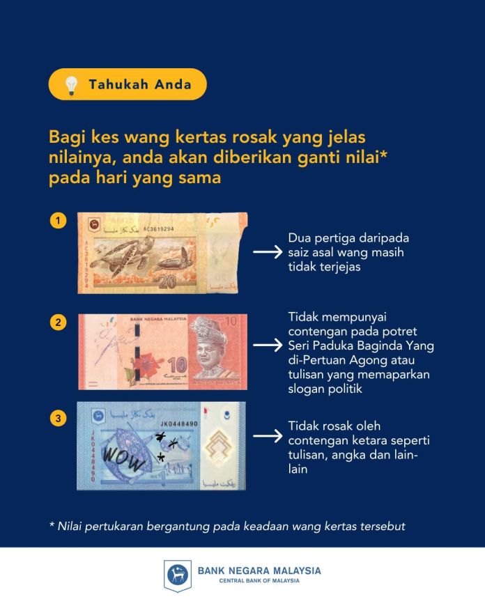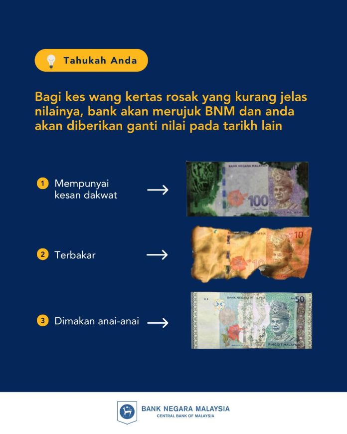 根据国家银行的Facebook贴文,即使你不是该银行的客户,也可以在任何银行更换破损的钞票。国行强调,只要钞票还能识别其价值,你就能在同一天获得相同额度的更换。