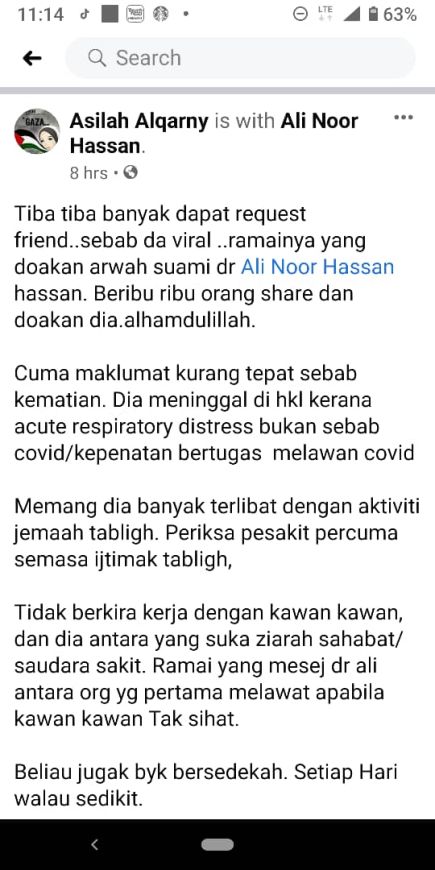 阿里医生的太太以Asilah Alqarny名义开设脸书,贴文澄清说:“他不是因为抗疫过劳而死,纵然他确实是在前线汲汲营营的医生之一,也曾在各宗教活动上为病人做免费检查。”
