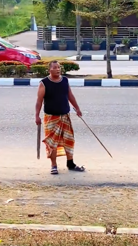近日,一位网友在网上分享了一段视频,一名穿着马来大叔身穿黑色背心和穿着sarong。因为不满大批mat rempit飙车制造噪音,手拿木棍和藤条就这样站在路中央,要阻止他们在马路上做出危险的骑摩托特技。