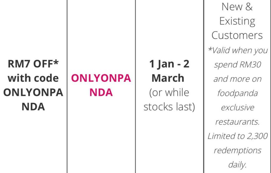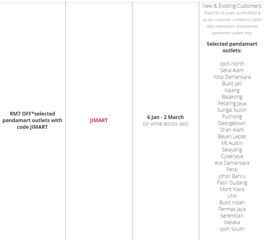 只要消费满RM30即可使用Promo code获得RM7折扣,每日只限首2600个兑换,兑完就要等第2天更新,只限指定Pandamart,优惠到3月2日截至!