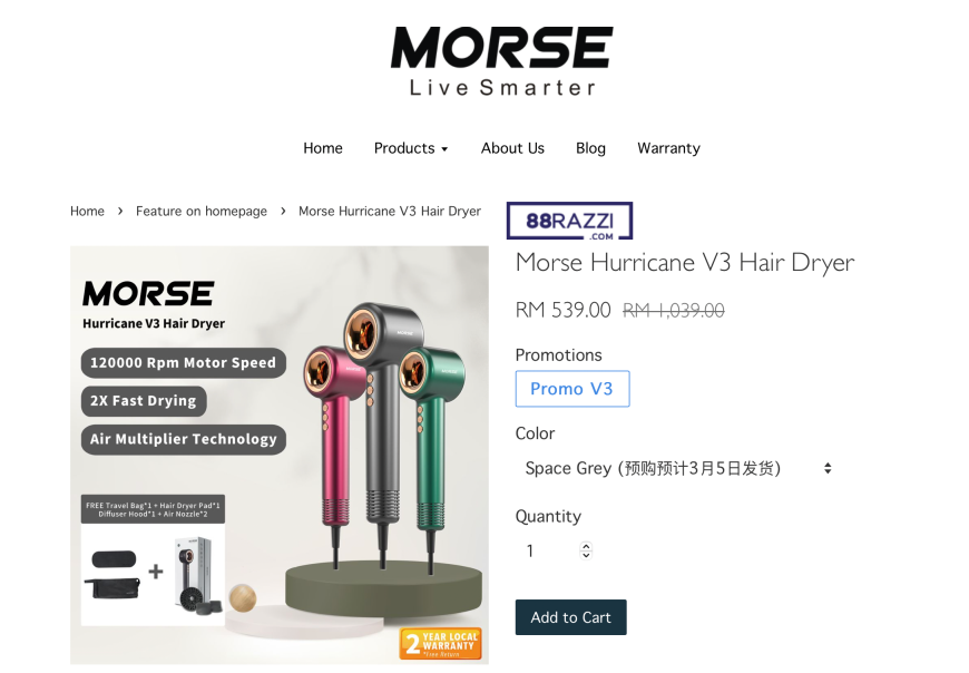 小编帮大家看了,这台Morse吹风机只需要RM539而已,比Dyson便宜超级多!还有绅士灰、灰、玫红、复古青4种颜色!!目前在Shopee已经售完了,大家可以去他们的官网看看哦!!