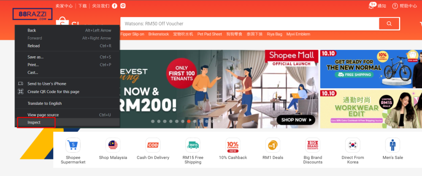 Step 4:打开Shopee并登录账号,在橙色的地方按右键选择Inspect