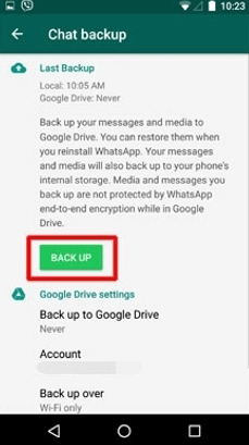 4. 点击“Backup” 即可完成备份,换新手机后登入是聊天记录就会从Google Drive 还原到新手机
