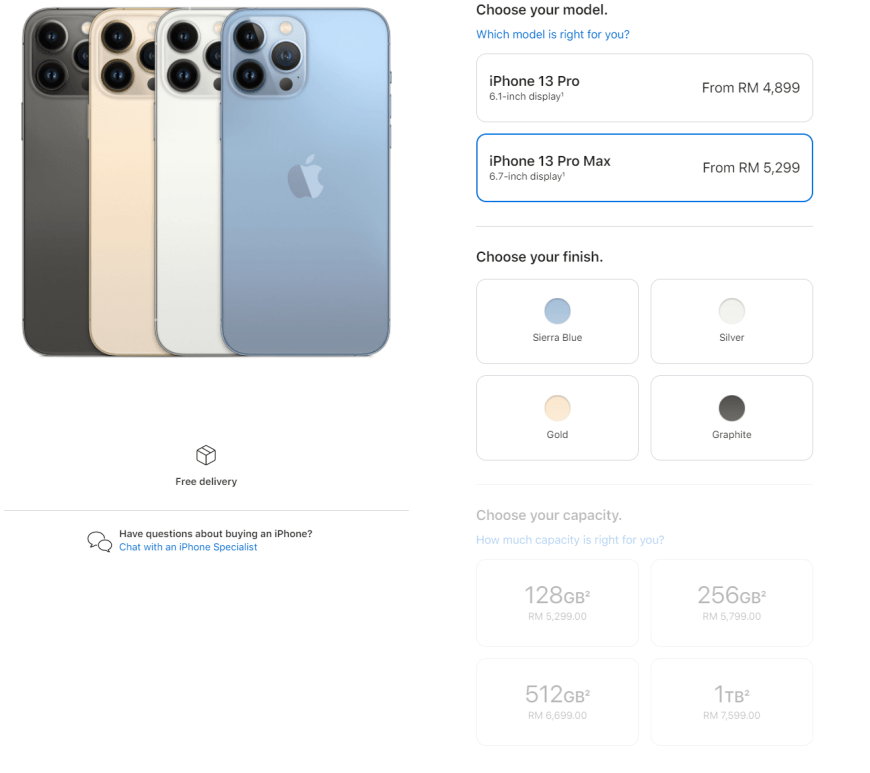 Apple也公布了iPhone 13系列的大马售价,首先本次的iPhone共有三个容量存储空间,iPhone 13 mini 128GB售RM3399、256GB售RM3899、512GB售RM4799。iPhone 13 128GB则售RM3899、256GB售RM4399、512GB则售RM5299,