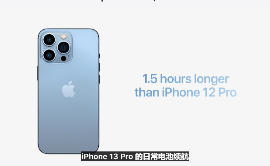 在续航部分,根据Apple的说法来看,iPhone 13 Pro系列是目前具备最高续航表现的 iPhone手机。iPhone 13 Pro的日常续航相较于 iPhone 12 Pro提升了1.5个小时;iPhone 13 Pro Max的日常续航相较于 iPhone 12 Pro Max更是提升了 2.5个小时。