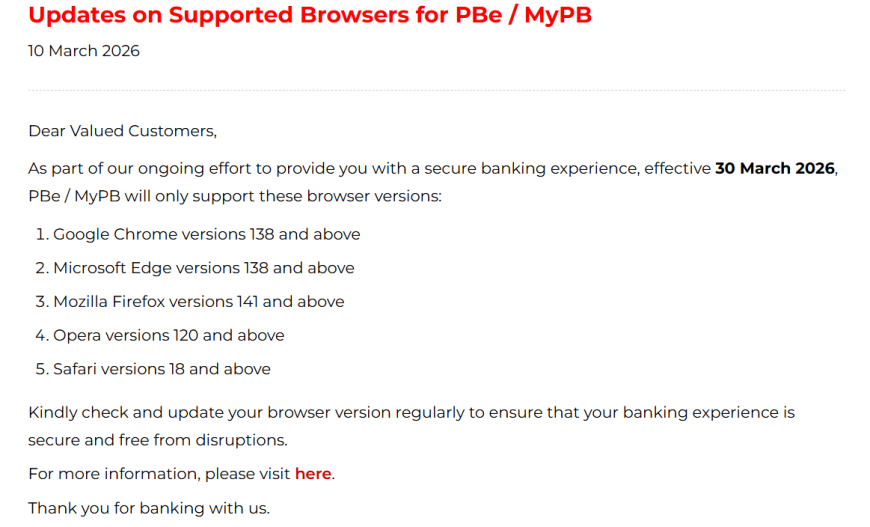 各位Public Bank用户注意啦!从2026年3月30日起,Public Bank将强制要求使用更新版本的浏览器登入PBe和MyPB。如果你的浏览器过旧,将无法正常使用网上银行服务了!