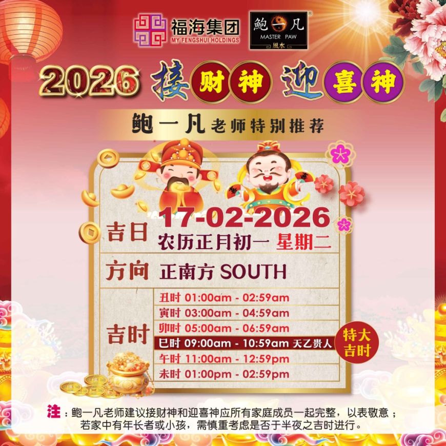 根据 鲍一凡老师 的推算,2026 年迎接财神与喜神的最佳吉时为:
